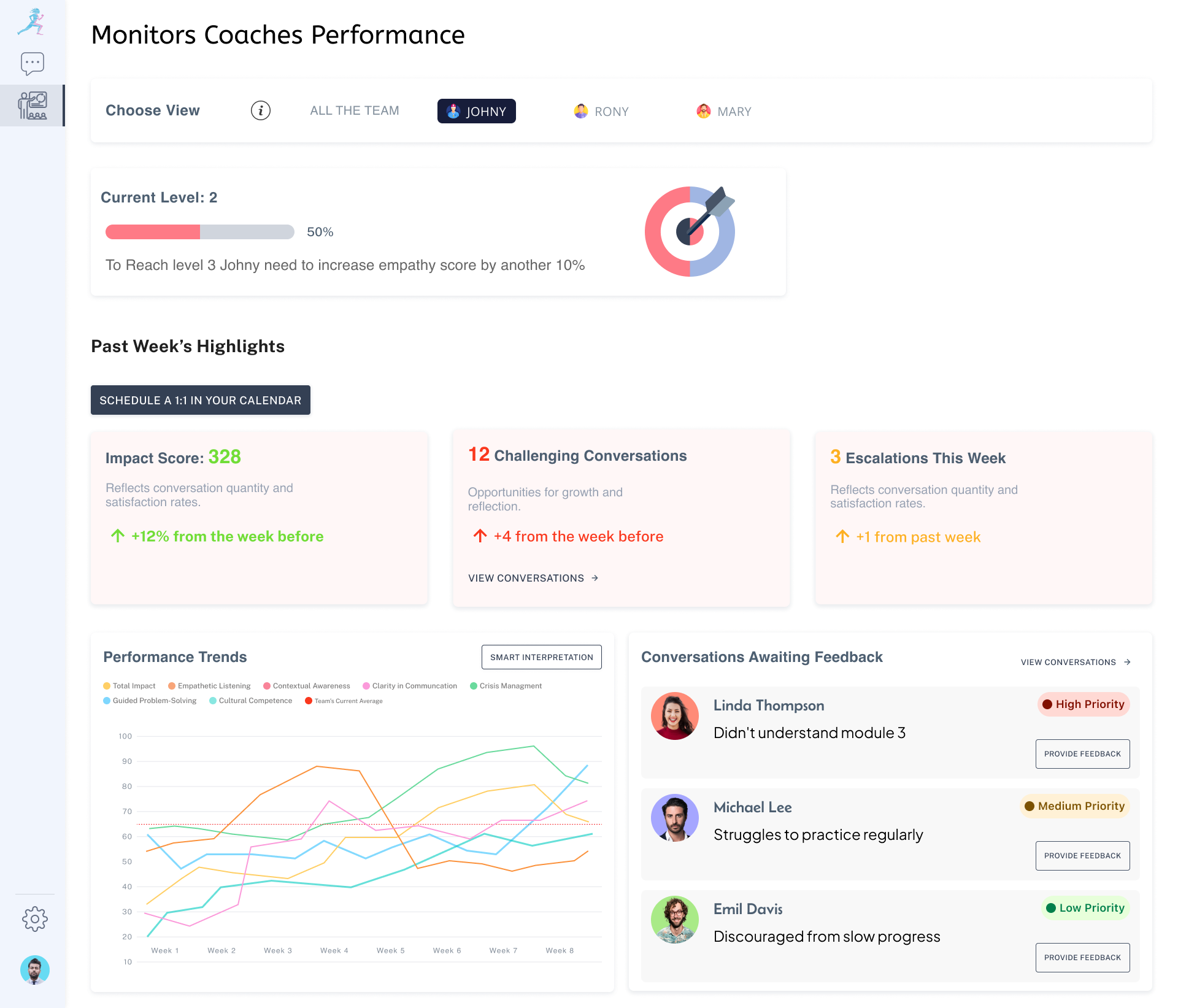 As your business takes off, rest easy knowing new coaches are fully supported. Use the dashboard to monitor each coach’s performance, guide their development, and let them handle trainee conversations that match their level.